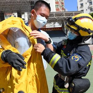 9月6日,在乌鲁木齐市第一中学,七年级9班学生谭明凯(左)在乌鲁木齐市消防救援支队消防员的指导下体验防化服。