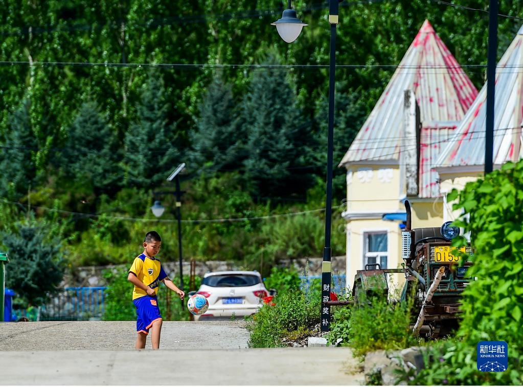 8月6日,在鄂伦春自治旗大杨树镇多布库尔猎民村,一名男孩在村里踢足球。新华社记者 连振 摄