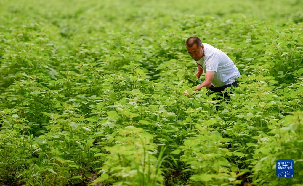 8月6日,在鄂伦春自治旗大杨树镇,当地村民查看紫苏生长情况。新华社记者 连振 摄