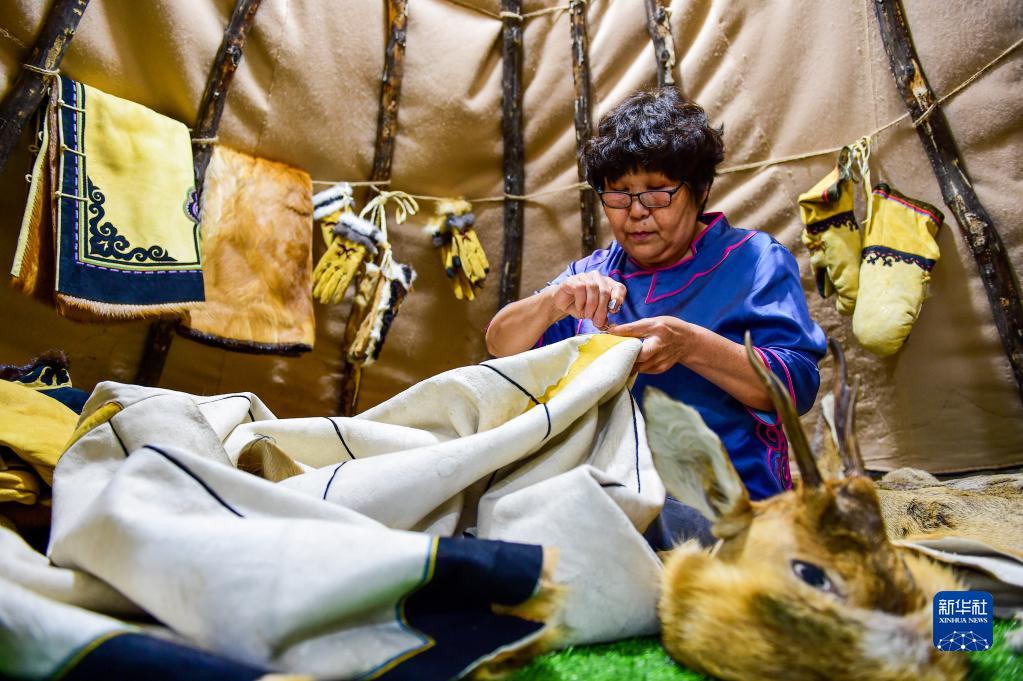 8月4日,在鄂伦春自治旗阿里河镇,吴玲芝在缝制一件兽皮衣,她是鄂伦春狍角帽制作技艺内蒙古自治区级非遗传承人。新华社记者 连振 摄